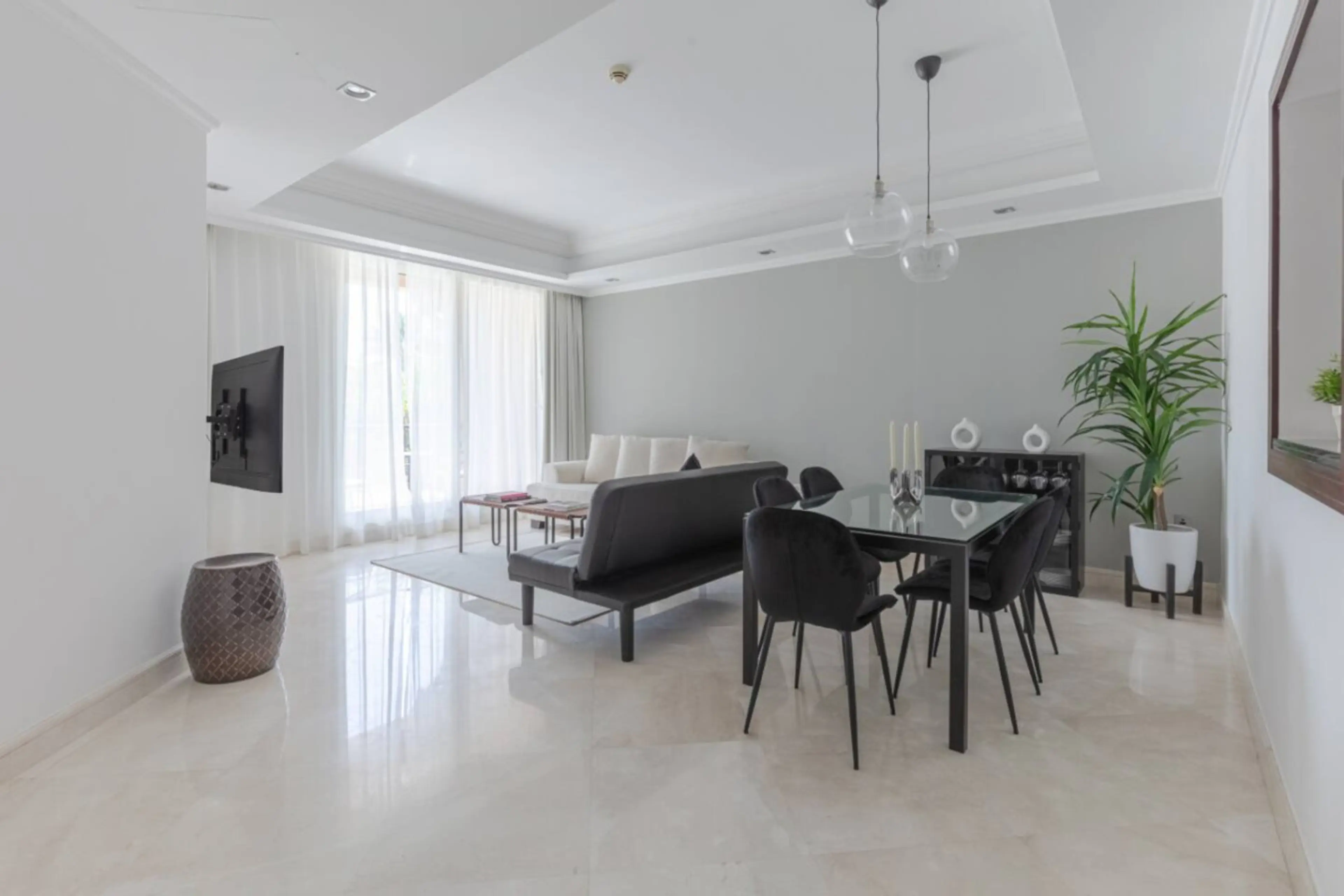 This beautiful fully-equipped 1-bedroom apartment is located on The Palm Jumeirah, Dubai's very popular landmark, and has a view of the garden. Available to you are on-premise BEACH and POOL and a fully equipped apartment with a stocked kitchen with everything needed to live. Bedroom: queen bed an...