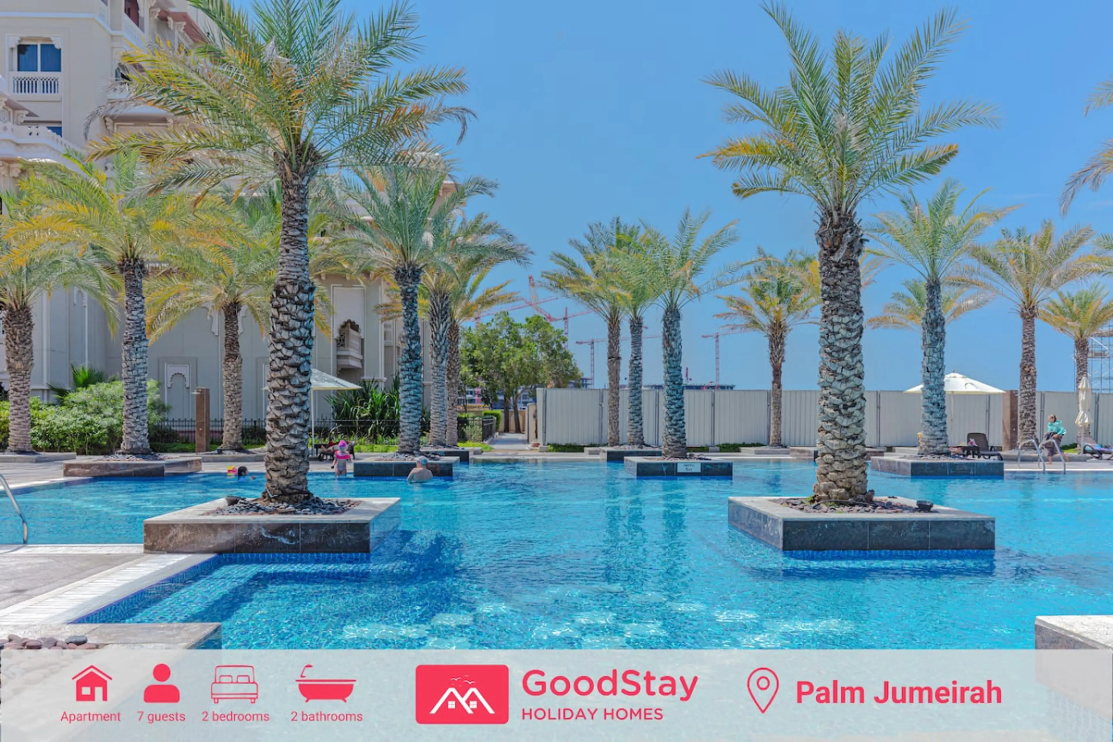 This posh fully-equipped 2-bedroom apartment is located on The Palm Jumeirah, Dubai's famous man-built island. It is perfect for high-end comfortable living. Available to you are our private BEACH and POOL and fully equipped apartment with kitchen. You can enjoy the view from 2 balconies. Neighbor...