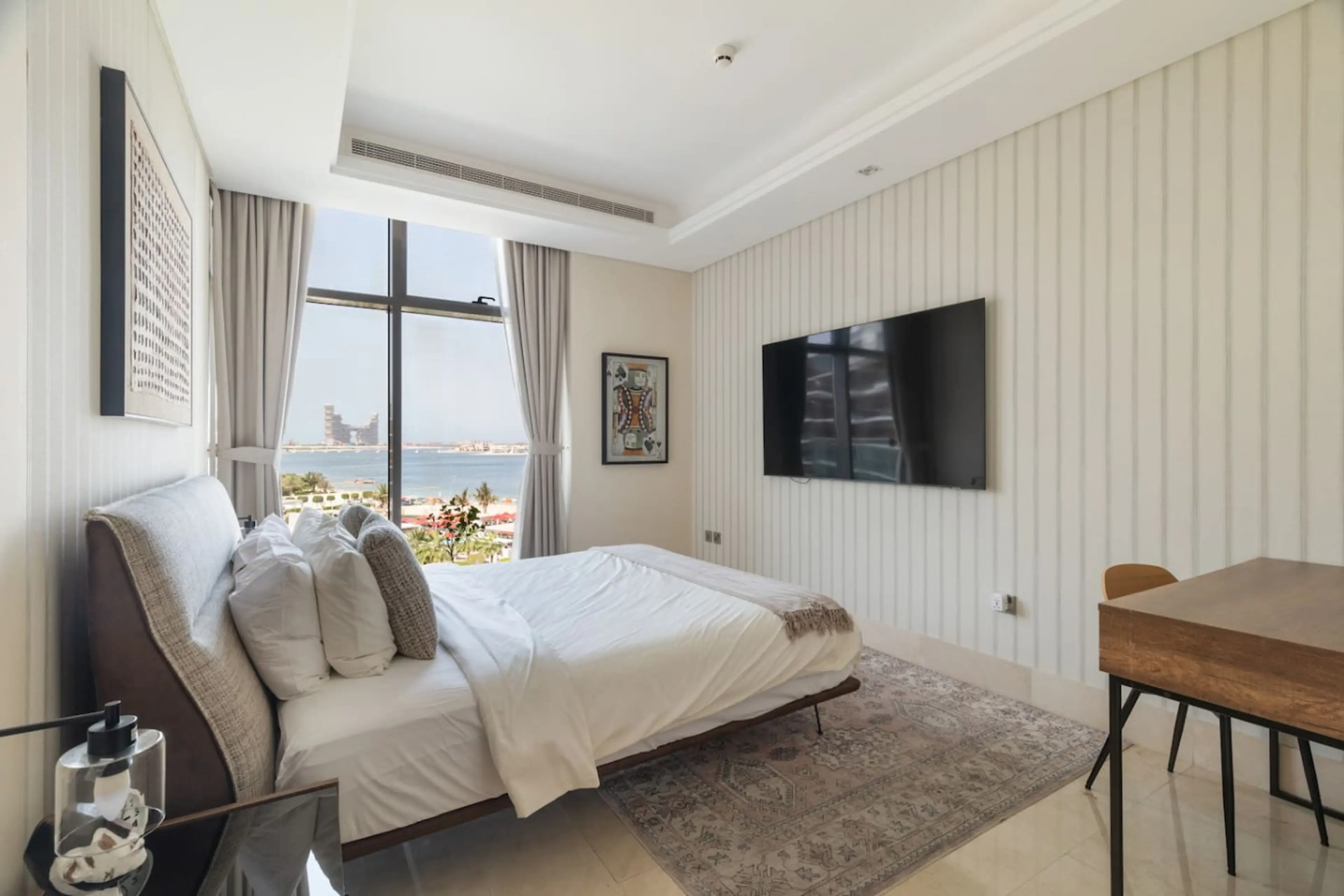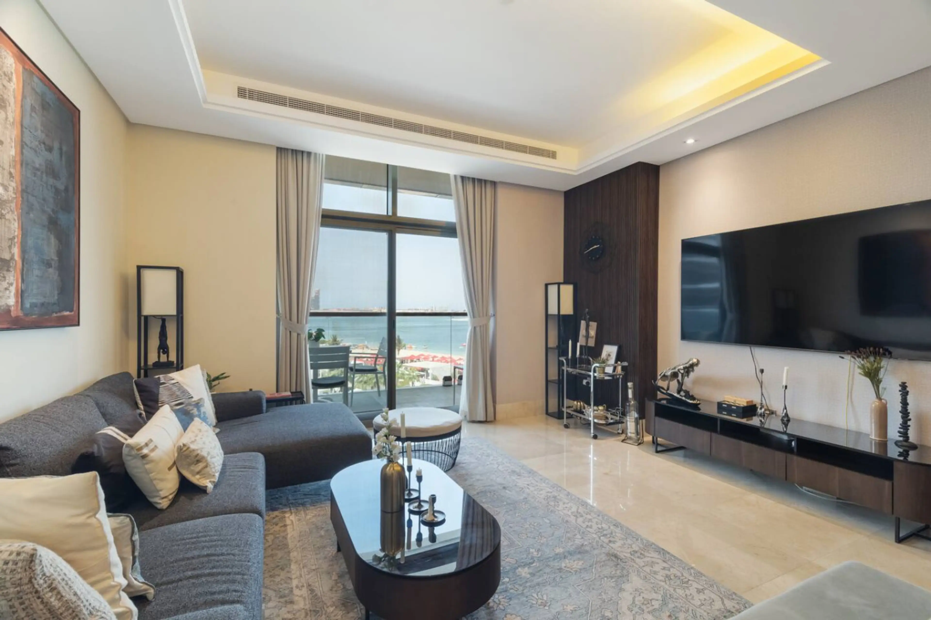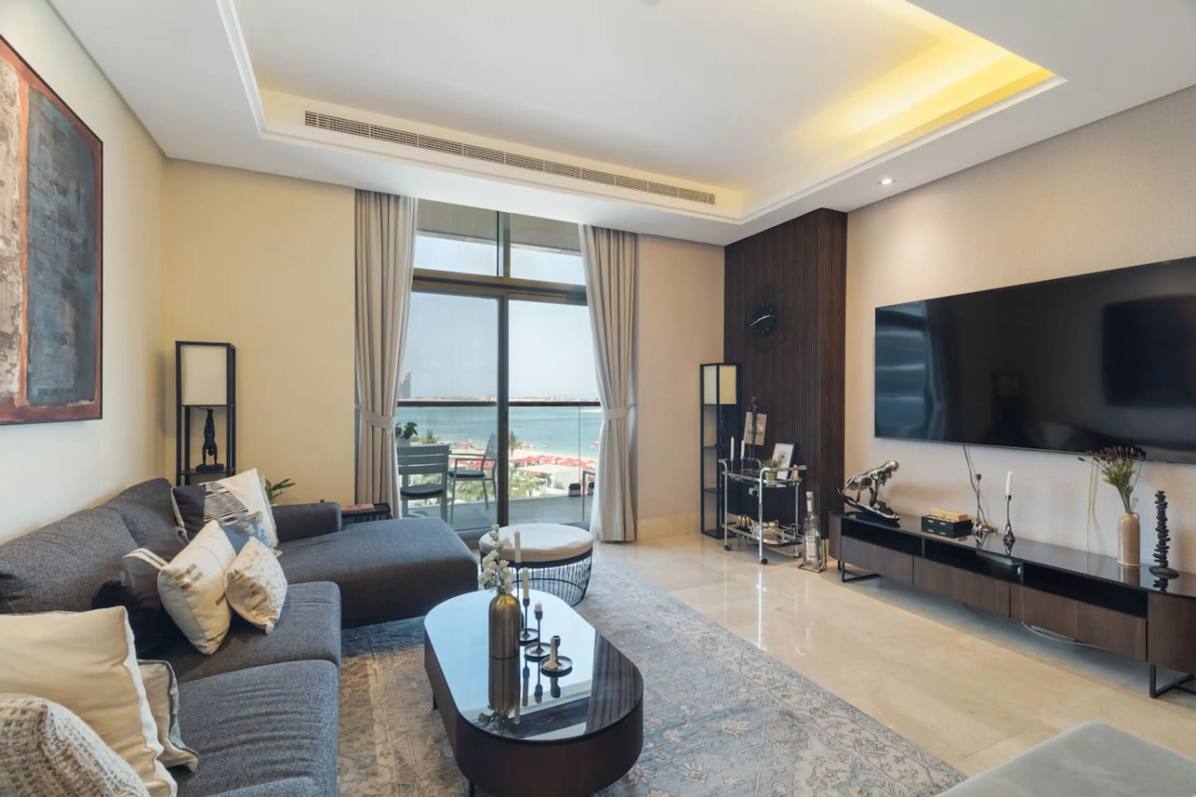 This spacious 2-br apartment on Palm Jumeirah has its own BEACH and SWIMMING POOL with a breathtaking high-floor view available to all guests for free! This apartment can comfortably accommodate 5 people so that a big family can enjoy all hotel amenities together. PARKING, GYM, BEACH, SWIMMING POO...