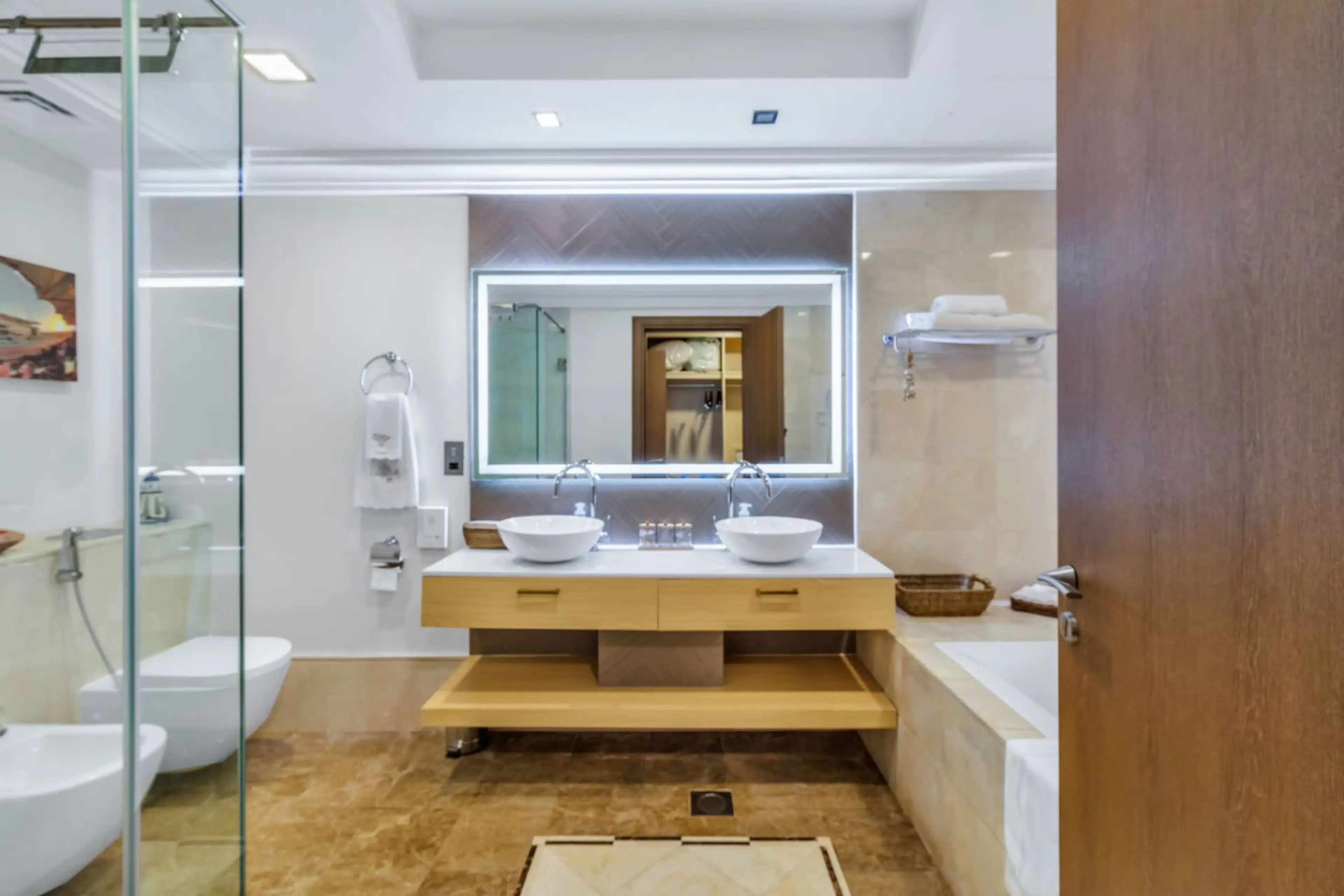 This beautiful fully-equipped 1 bedroom apartment is located on The Palm Jumeirah, Dubai's popular landmark. It is perfect for family vacations. Available to you are our private BEACH, POOL & GYM and fully equipped apartment with a kitchen. It has everything needed for a comfortable stay, a fully-...