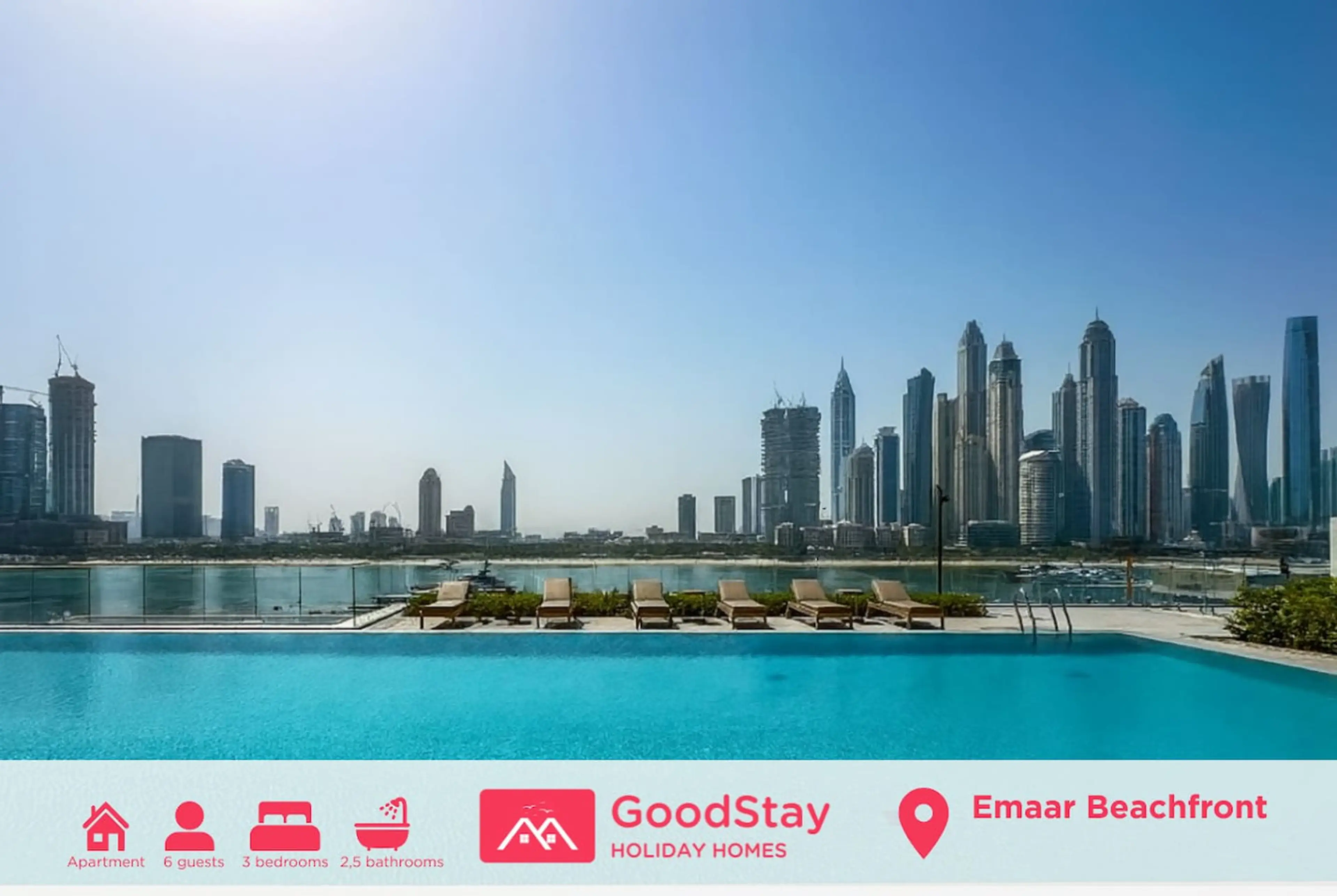 Elegant & luxurious 3-bedroom apartment in Dubai’s Emaar Beachfront — a private, upscale beachfront community. Comfortably accommodates up to 6 guests. Fully equipped with a PRIVATE BALCONY offering breathtaking sunsets and panoramic views of the Palm Jumeirah skyline — ideal for relaxation. Perfe...